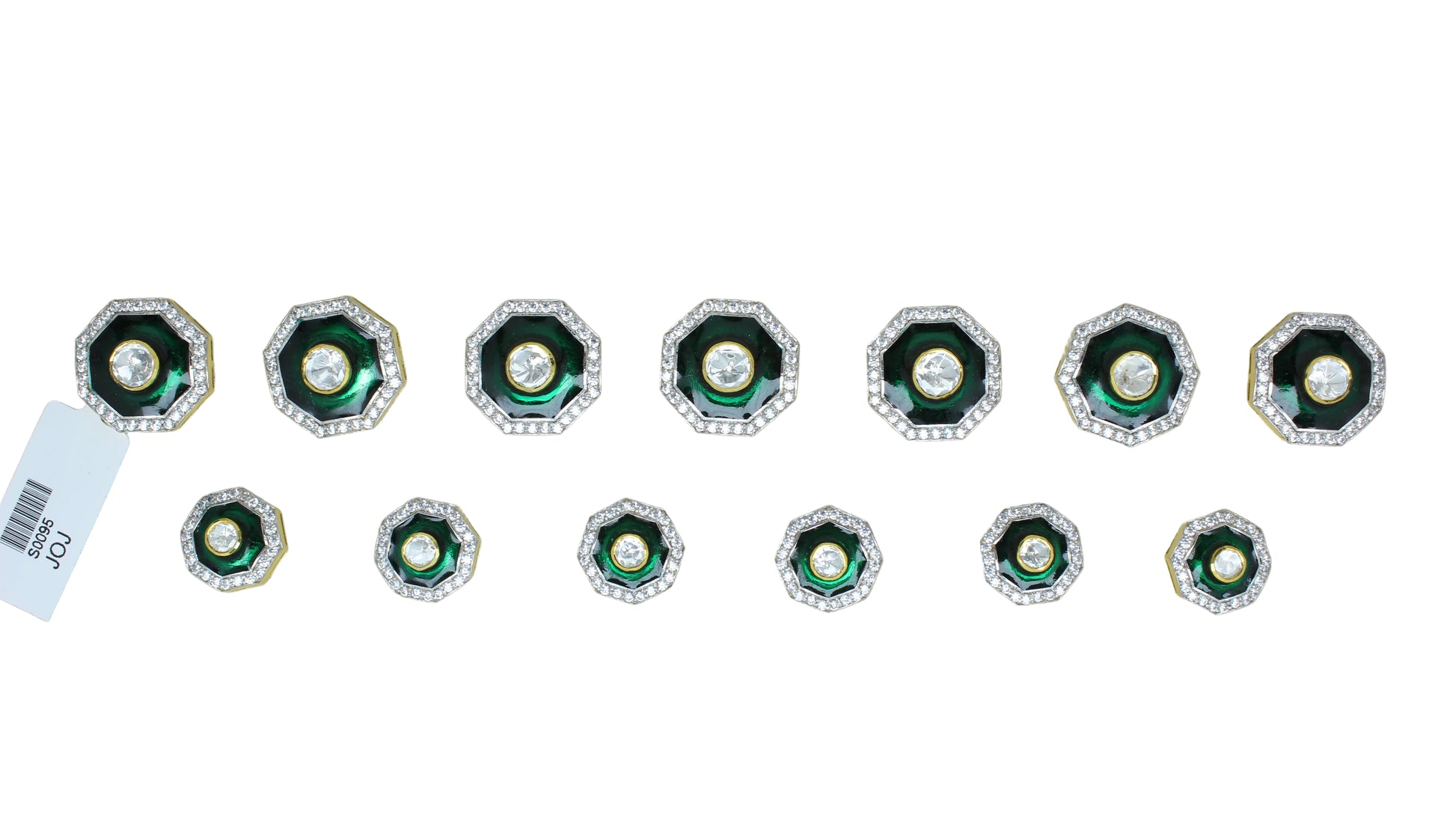 Add a regal touch to your sherwani or Jodhpuri with this set of Bottle Green Meena Buttons crafted from 925 silver and accented with sparkling moissanite and CZ stones. The set includes 7 beautifully detailed buttons for your outfit and 6 matching cufflinks, blending traditional craftsmanship with contemporary elegance. The striking blue meena enamel highlights each piece, making it a perfect accessory to elevate your men’s wear with subtle luxury and cultural flair.