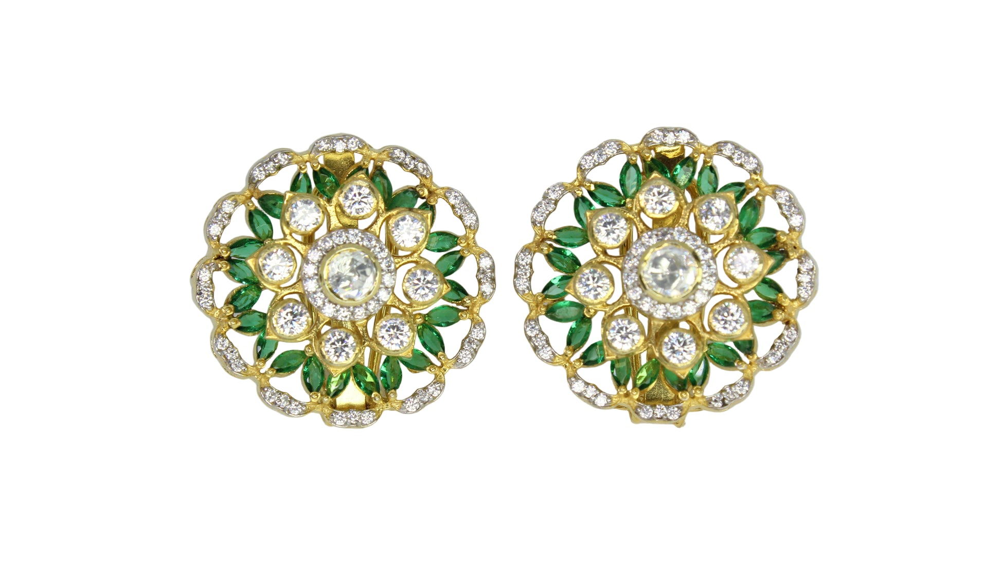 Crafted from 925 sterling silver, these Floral Green Kundan Studs feature vibrant green stones paired with sparkling moissanite and cubic zirconia accents. Their elegant design makes them an ideal choice for weddings or thoughtful gifting, combining timeless beauty with expert craftsmanship for lasting shine and sophistication.