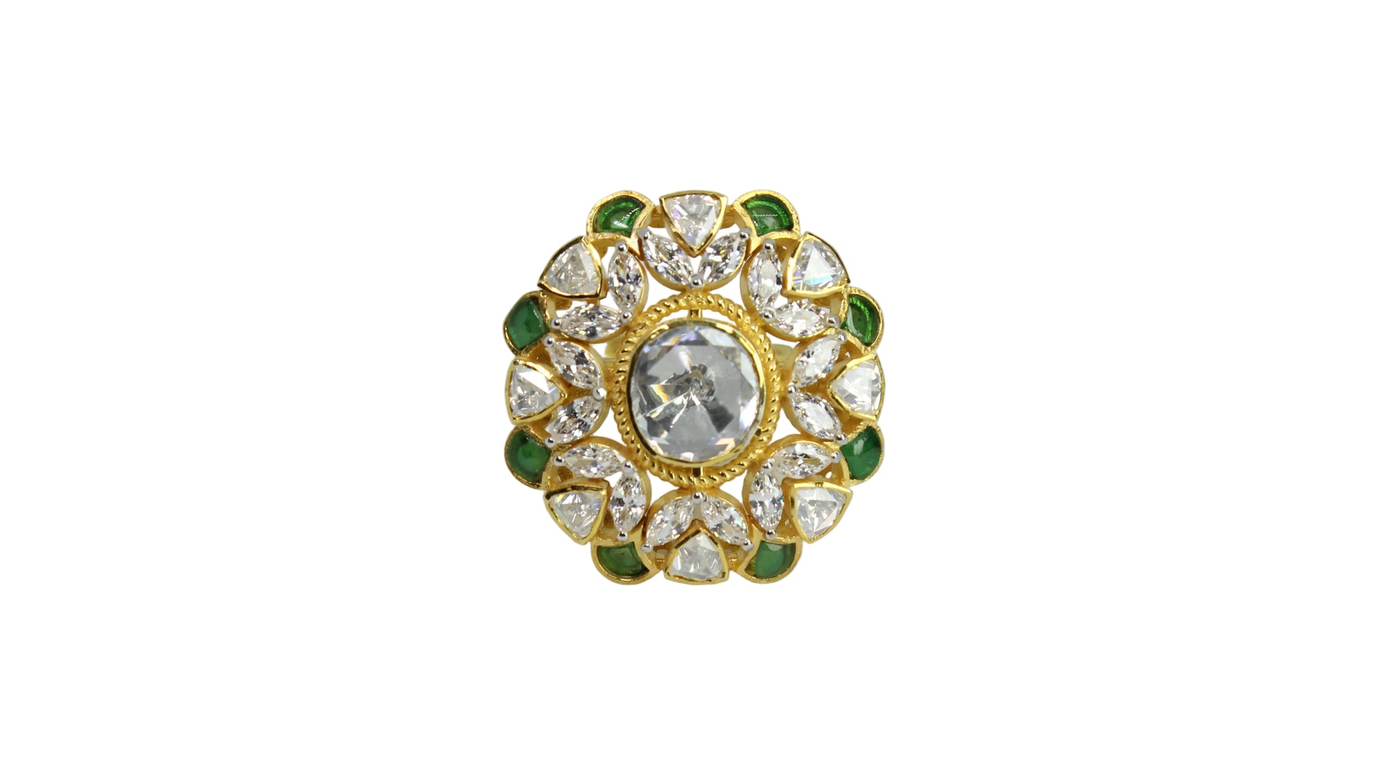 Embrace timeless elegance with this stunning Green Halo Polki Ring, a masterpiece of traditional Indian craftsmanship. Crafted in premium 925 silver, this ethnic beauty features a captivating green stone at its heart, surrounded by a luminous halo of moissanite and cubic zirconia that catches light from every angle. Perfect for weddings, festivals, and everyday glamour, this versatile polki ring seamlessly transitions from traditional ceremonies to contemporary cocktail events. Its intricate design celebrates heritage while offering modern sophistication. Available in all sizes, this fancy statement piece is your go-to accessory for adding a touch of regal charm to any ensemble.