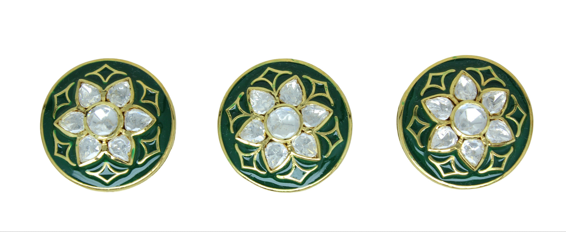 Elevate your sherwani or Jodhpuri suit with the Harit Pushp Polki Button set, crafted in genuine 925 silver. This exquisite collection features 7 main buttons and 6 cufflinks, blending royal elegance with timeless simplicity. Its charming and classic design adds a refined touch, making every ensemble stand out with subtle sophistication. Perfect for those seeking understated grandeur in their traditional attire.